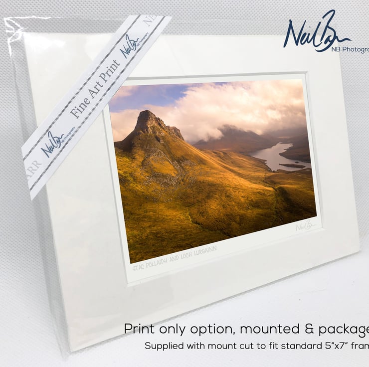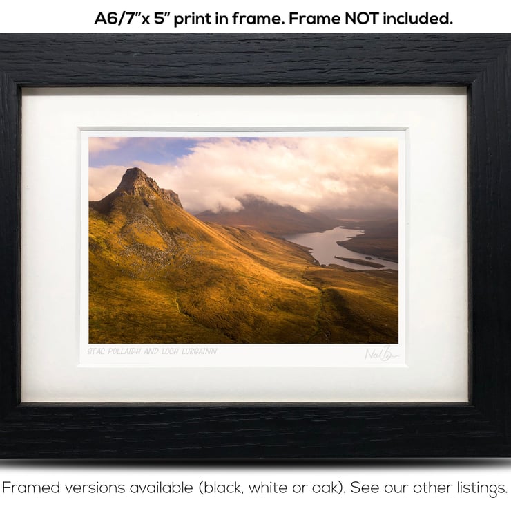 Supplied already mounted, wrapped & with signed labels & certificate, the image is printed on A6 size fine art paper (148x105mm). The actual image size is smaller (see listing images for sizes - image approx. 115x77mm) to allow for the signature & inscription. The 100% acid-free mount is cut to fit standard ready-made frames from high street stores. EXTERNAL mount size is 7"x5". This is the OUTSIDE size of the mount (and thus the size your frame should be).