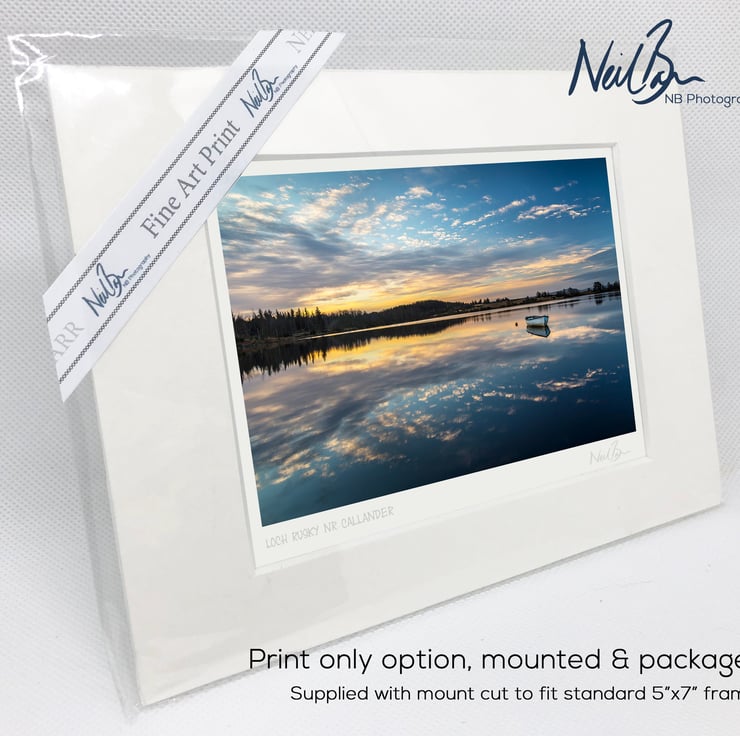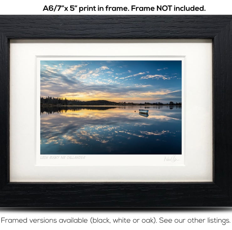 Supplied already mounted, wrapped & with signed labels & certificate, the image is printed on A6 size fine art paper (148x105mm). The actual image size is smaller (see listing images for sizes - image approx. 115x77mm) to allow for the signature & inscription. The 100% acid-free mount is cut to fit standard ready-made frames from high street stores. EXTERNAL mount size is 7"x5". This is the OUTSIDE size of the mount (and thus the size your frame should be).
