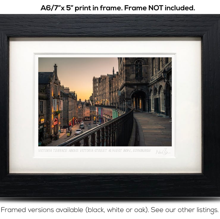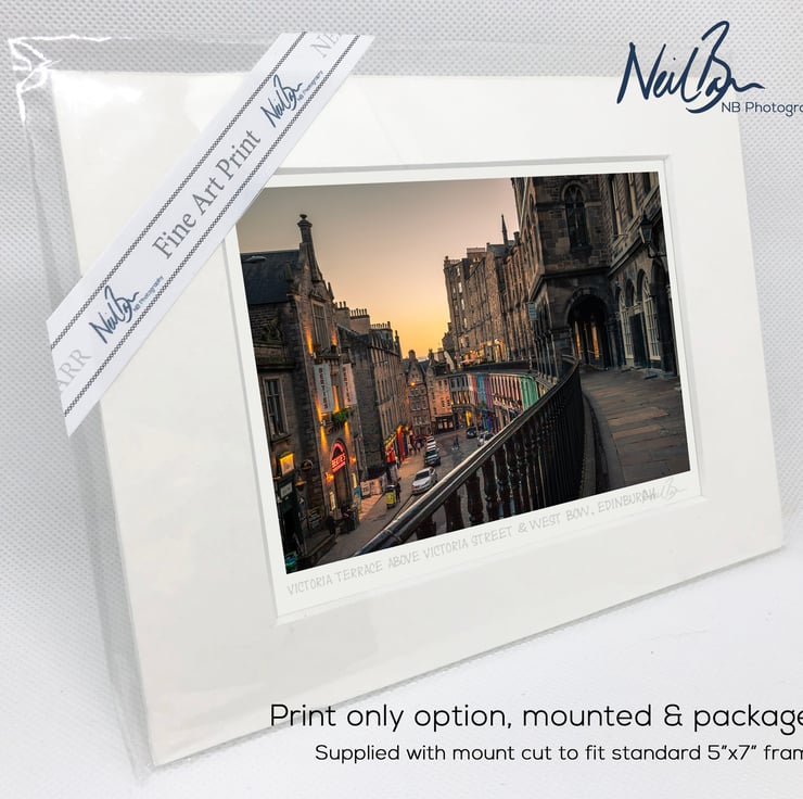 Supplied already mounted, wrapped & with signed labels & certificate, the image is printed on A6 size fine art paper (148x105mm). The actual image size is smaller (see listing images for sizes - image approx. 115x77mm) to allow for the signature & inscription. The 100% acid-free mount is cut to fit standard ready-made frames from high street stores. EXTERNAL mount size is 7"x5". This is the OUTSIDE size of the mount (and thus the size your frame should be).