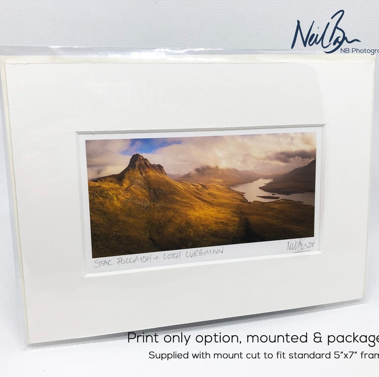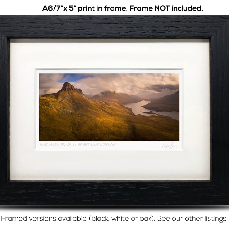 Supplied already mounted, wrapped & with signed labels & certificate, the image is printed on A6 size fine art paper (148x105mm). The actual image size is smaller (see listing images for sizes - image approx. 115x55mm) to allow for the signature & inscription. The 100% acid-free mount is cut to fit standard ready-made frames from high street stores. EXTERNAL mount size is 7"x5". This is the OUTSIDE size of the mount (and thus the size your frame should be).