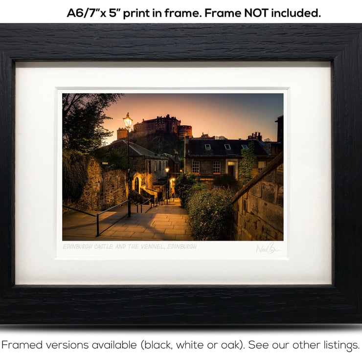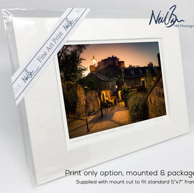 Supplied already mounted, wrapped & with signed labels & certificate, the image is printed on A6 size fine art paper (148x105mm). The actual image size is smaller (see listing images for sizes - image approx. 115x77mm) to allow for the signature & inscription. The 100% acid-free mount is cut to fit standard ready-made frames from high street stores. EXTERNAL mount size is 7"x5". This is the OUTSIDE size of the mount (and thus the size your frame should be).