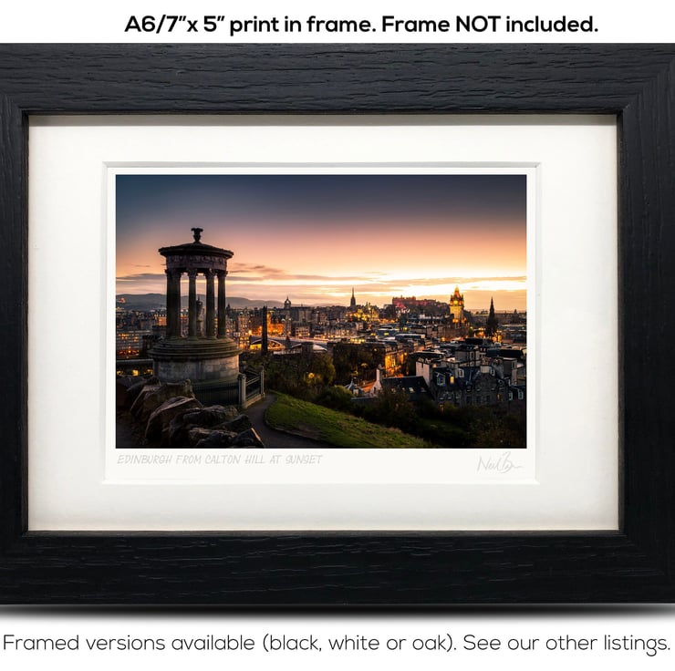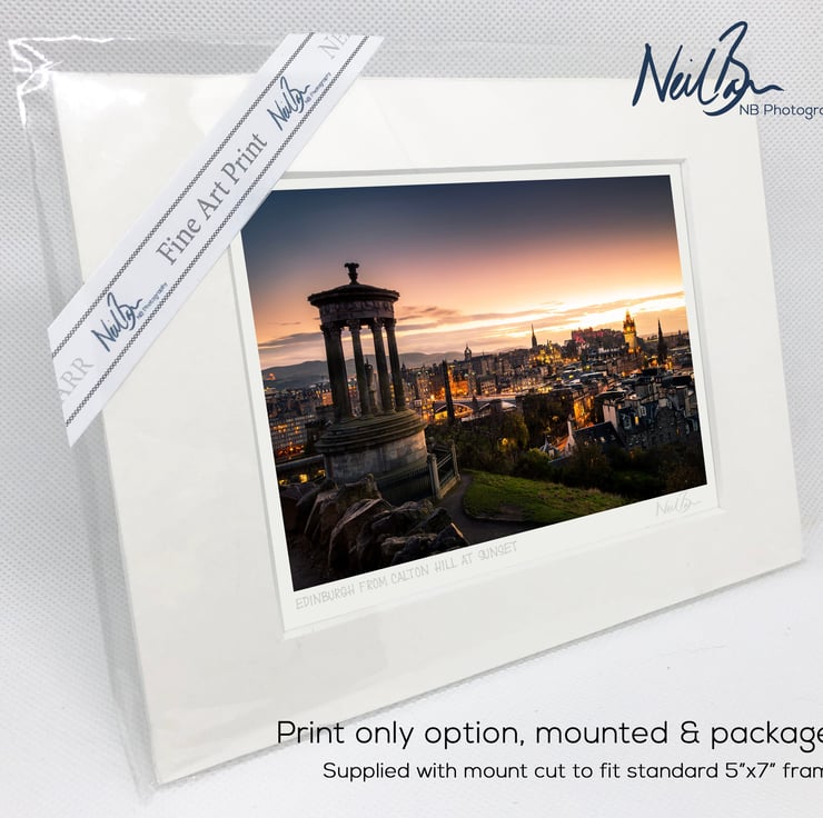 Supplied already mounted, wrapped & with signed labels & certificate, the image is printed on A6 size fine art paper (148x105mm). The actual image size is smaller (see listing images for sizes - image approx. 115x77mm) to allow for the signature & inscription. The 100% acid-free mount is cut to fit standard ready-made frames from high street stores. EXTERNAL mount size is 7"x5". This is the OUTSIDE size of the mount (and thus the size your frame should be).