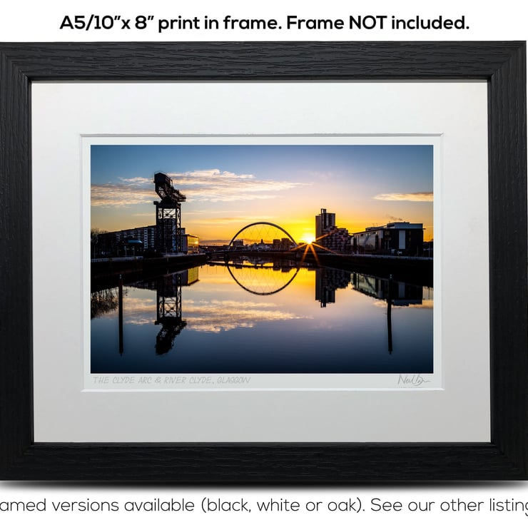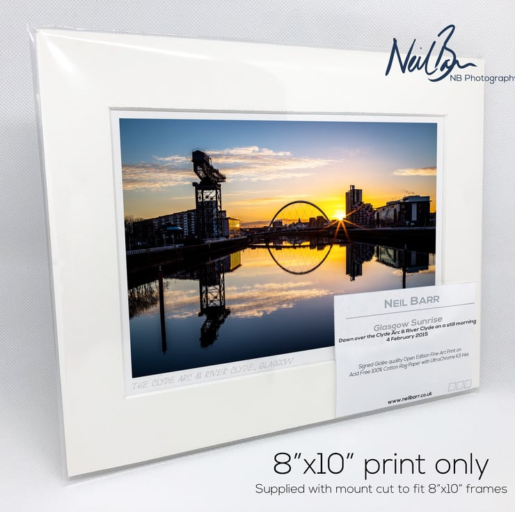 Supplied already mounted, wrapped & with signed labels & certificate, the image is printed on A5 size fine art paper (148x210mm). The actual image size is smaller (see listing images for sizes - image approx. 185x123mm) to allow for the signature & inscription. The 100% acid-free mount is cut to fit standard ready-made frames from high street stores. EXTERNAL mount size is 10"x8". This is the OUTSIDE size of the mount (and thus the size your frame should be).