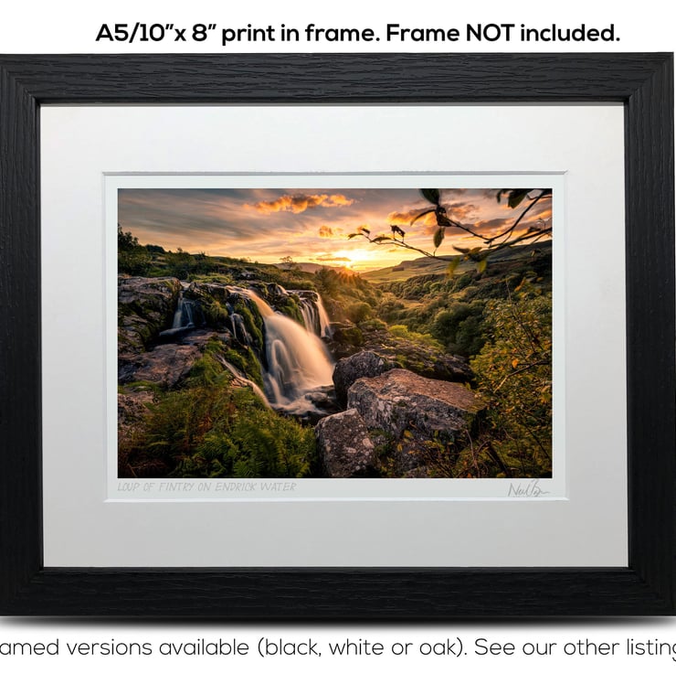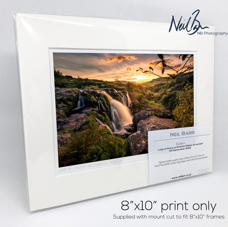 Supplied already mounted, wrapped & with signed labels & certificate, the image is printed on A5 size fine art paper (148x210mm). The actual image size is smaller (see listing images for sizes - image approx. 185x123mm) to allow for the signature & inscription. The 100% acid-free mount is cut to fit standard ready-made frames from high street stores. EXTERNAL mount size is 10"x8". This is the OUTSIDE size of the mount (and thus the size your frame should be).