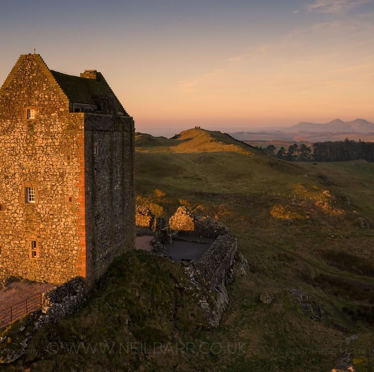 Image: "Smailholm" - Smailholm Tower and the Eildon Hills in the Scottish Borders at dawn, 26 February 2019 - by Scotland photographer Neil Barr