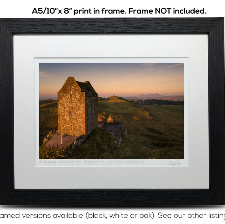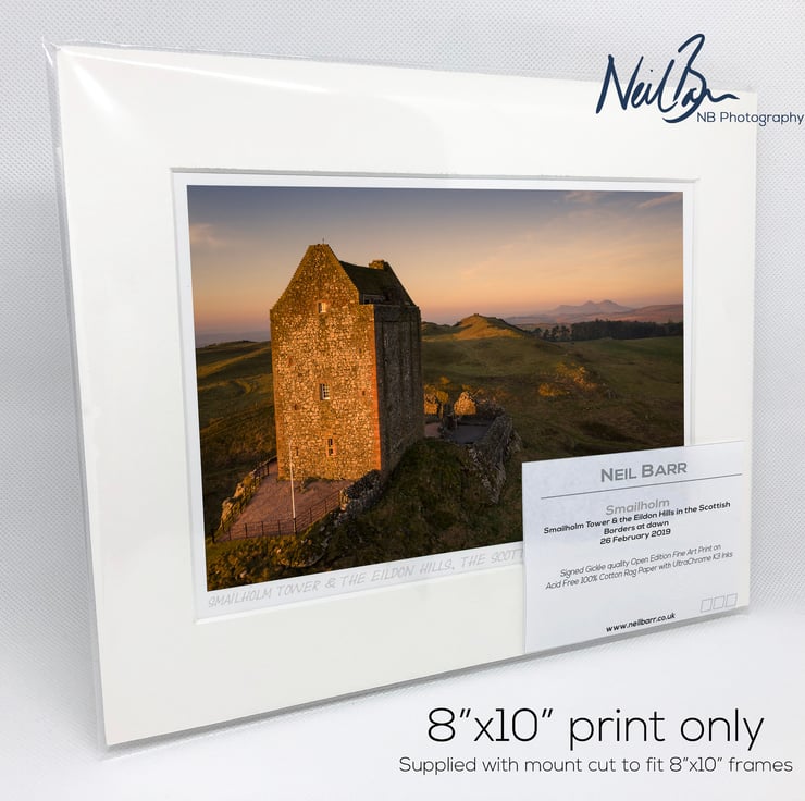 Supplied already mounted, wrapped & with signed labels & certificate, the image is printed on A5 size fine art paper (148x210mm). The actual image size is smaller (see listing images for sizes - image approx. 185x123mm) to allow for the signature & inscription. The 100% acid-free mount is cut to fit standard ready-made frames from high street stores. EXTERNAL mount size is 10"x8". This is the OUTSIDE size of the mount (and thus the size your frame should be).