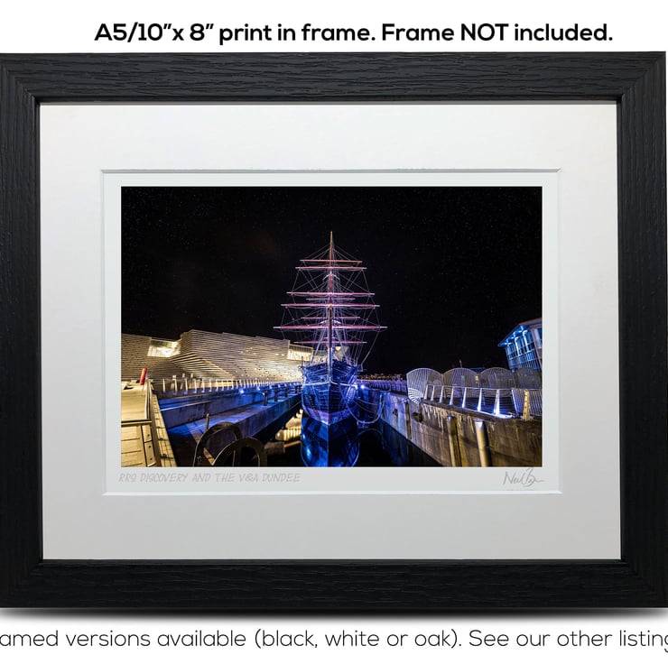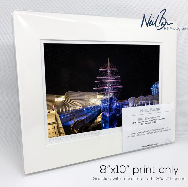Supplied already mounted, wrapped & with signed labels & certificate, the image is printed on A5 size fine art paper (148x210mm). The actual image size is smaller (see listing images for sizes - image approx. 185x123mm) to allow for the signature & inscription. The 100% acid-free mount is cut to fit standard ready-made frames from high street stores. EXTERNAL mount size is 10"x8". This is the OUTSIDE size of the mount (and thus the size your frame should be).