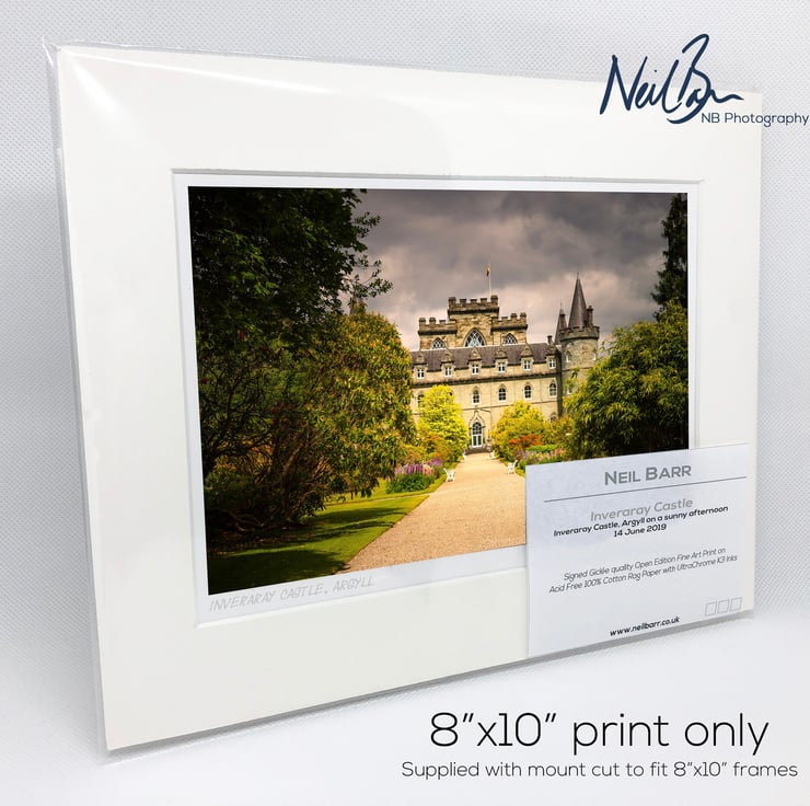 Supplied already mounted, wrapped & with signed labels & certificate, the image is printed on A5 size fine art paper (148x210mm). The actual image size is smaller (see listing images for sizes - image approx. 185x123mm) to allow for the signature & inscription. The 100% acid-free mount is cut to fit standard ready-made frames from high street stores. EXTERNAL mount size is 10"x8". This is the OUTSIDE size of the mount (and thus the size your frame should be).