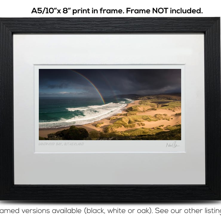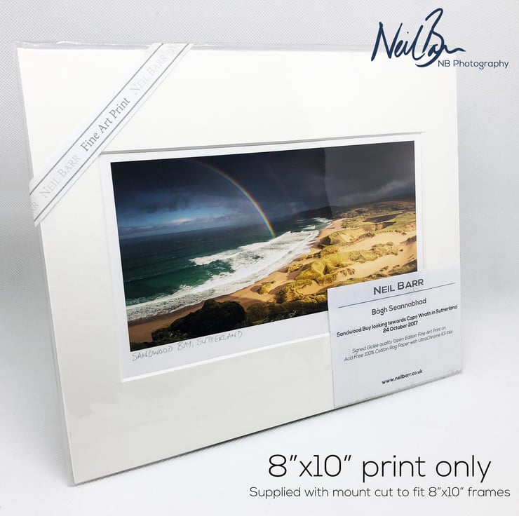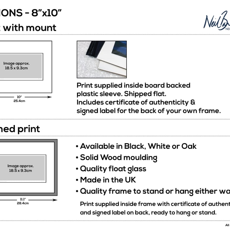Supplied already mounted, wrapped & with signed labels & certificate, the image is printed on A5 size fine art paper (148x210mm). The actual image size is smaller (see listing images for sizes - image approx. 185x93mm) to allow for the signature & inscription. The 100% acid-free mount is cut to fit standard ready-made frames from high street stores. EXTERNAL mount size is 10"x8". This is the OUTSIDE size of the mount (and thus the size your frame should be).