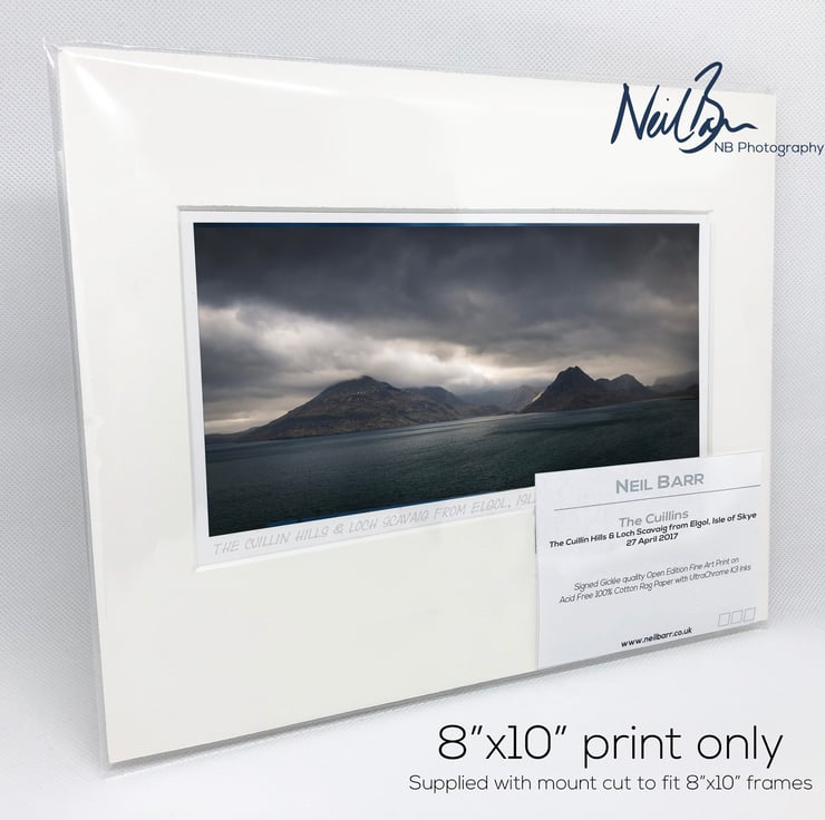 Supplied already mounted, wrapped & with signed labels & certificate, the image is printed on A5 size fine art paper (148x210mm). The actual image size is smaller (see listing images for sizes - image approx. 185x95mm) to allow for the signature & inscription. The 100% acid-free mount is cut to fit standard ready-made frames from high street stores. EXTERNAL mount size is 10"x8". This is the OUTSIDE size of the mount (and thus the size your frame should be).