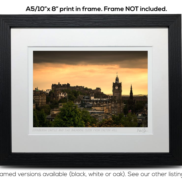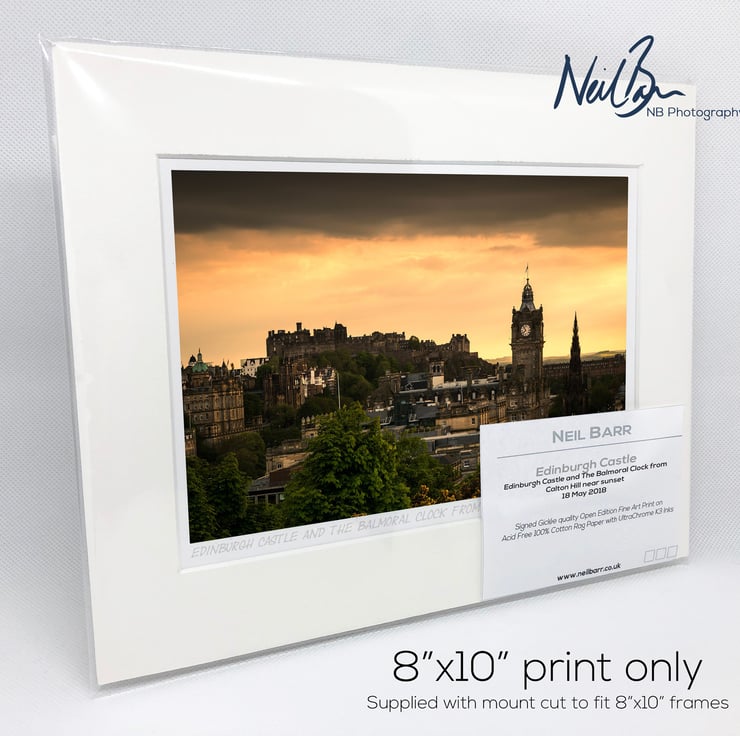 Supplied already mounted, wrapped & with signed labels & certificate, the image is printed on A5 size fine art paper (148x210mm). The actual image size is smaller (see listing images for sizes - image approx. 185x123mm) to allow for the signature & inscription. The 100% acid-free mount is cut to fit standard ready-made frames from high street stores. EXTERNAL mount size is 10"x8". This is the OUTSIDE size of the mount (and thus the size your frame should be).