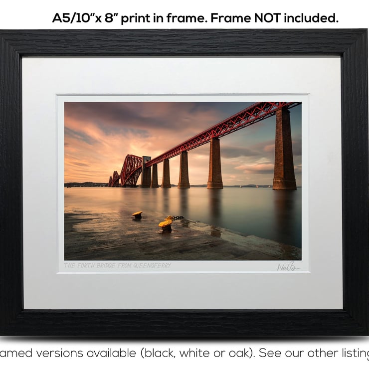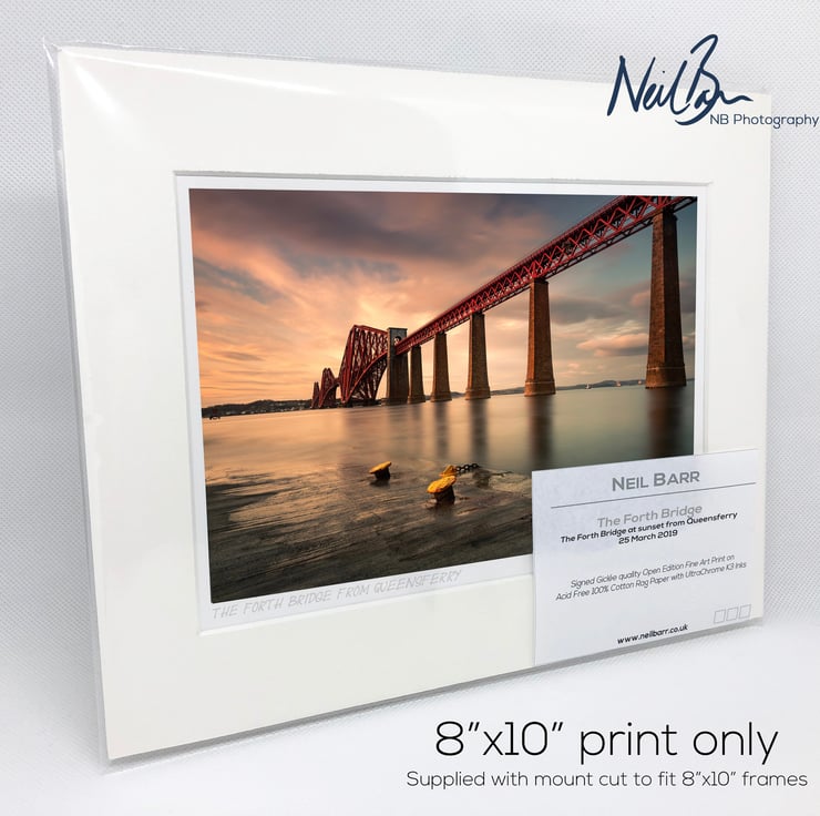 Supplied already mounted, wrapped & with signed labels & certificate, the image is printed on A5 size fine art paper (148x210mm). The actual image size is smaller (see listing images for sizes - image approx. 185x123mm) to allow for the signature & inscription. The 100% acid-free mount is cut to fit standard ready-made frames from high street stores. EXTERNAL mount size is 10"x8". This is the OUTSIDE size of the mount (and thus the size your frame should be).