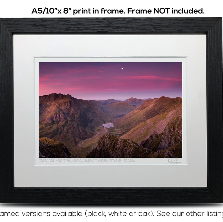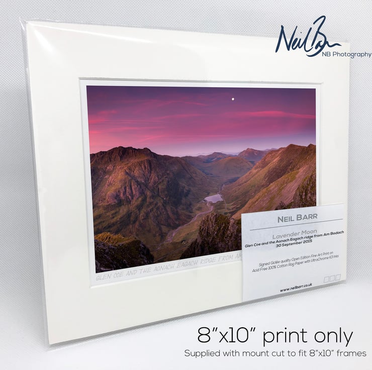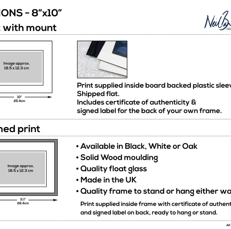Supplied already mounted, wrapped & with signed labels & certificate, the image is printed on A5 size fine art paper (148x210mm). The actual image size is smaller (see listing images for sizes - image approx. 185x123mm) to allow for the signature & inscription. The 100% acid-free mount is cut to fit standard ready-made frames from high street stores. EXTERNAL mount size is 10"x8". This is the OUTSIDE size of the mount (and thus the size your frame should be).