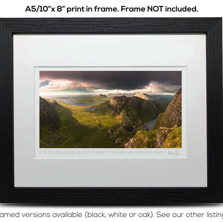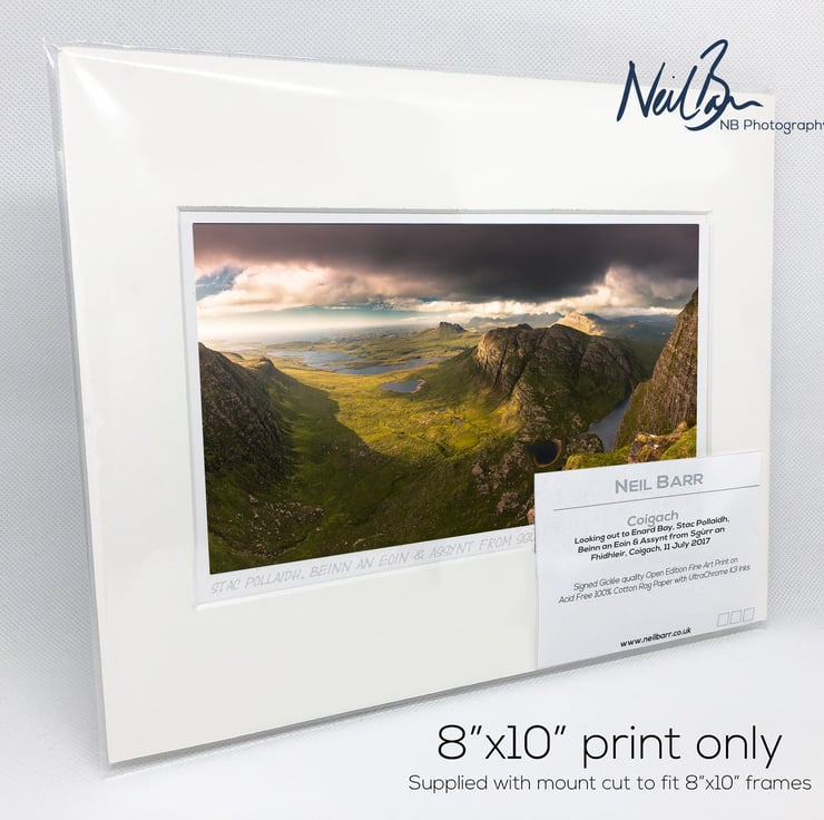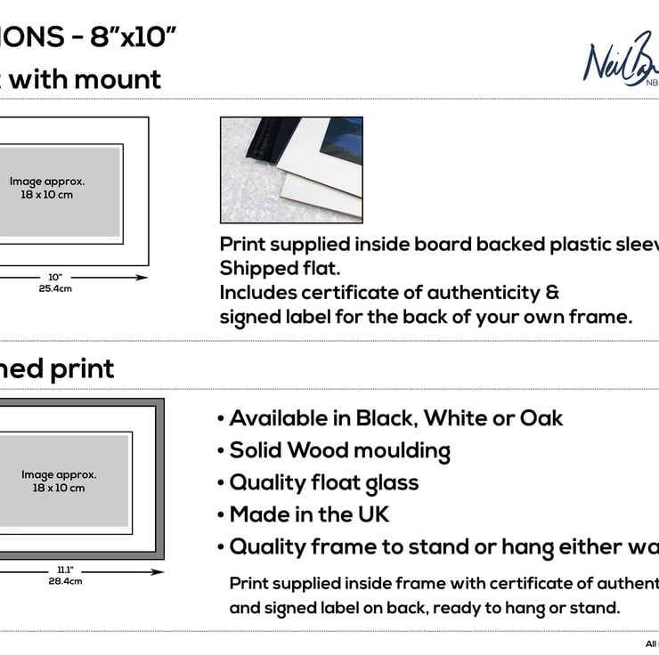 Supplied already mounted, wrapped & with signed labels & certificate, the image is printed on A5 size fine art paper (148x210mm). The actual image size is smaller (see listing images for sizes - image approx. 185x100mm) to allow for the signature & inscription. The 100% acid-free mount is cut to fit standard ready-made frames from high street stores. EXTERNAL mount size is 10"x8". This is the OUTSIDE size of the mount (and thus the size your frame should be).
