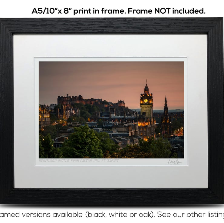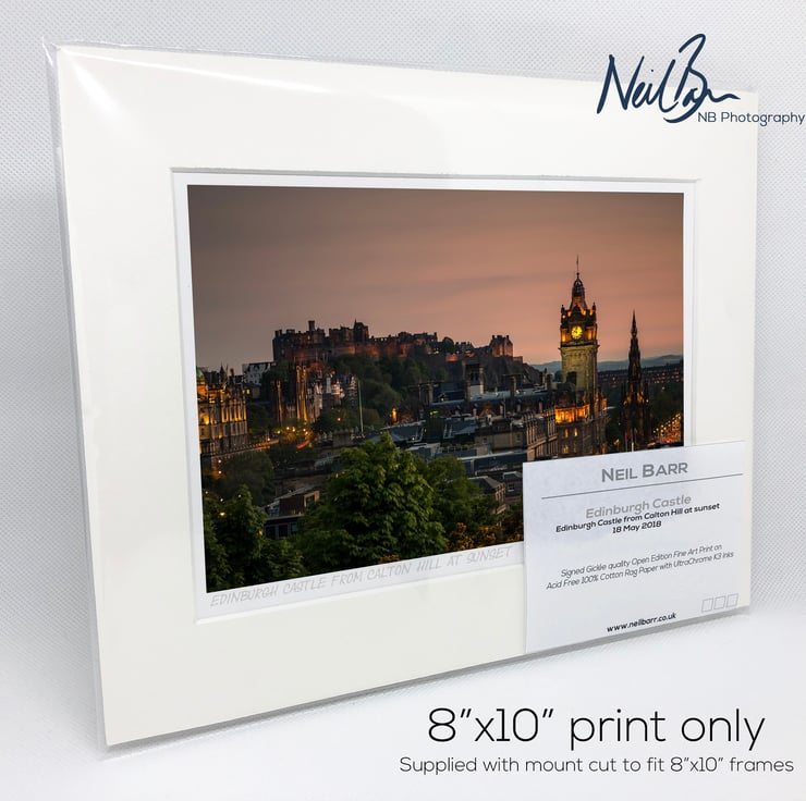 Supplied already mounted, wrapped & with signed labels & certificate, the image is printed on A5 size fine art paper (148x210mm). The actual image size is smaller (see listing images for sizes - image approx. 185x123mm) to allow for the signature & inscription. The 100% acid-free mount is cut to fit standard ready-made frames from high street stores. EXTERNAL mount size is 10"x8". This is the OUTSIDE size of the mount (and thus the size your frame should be).