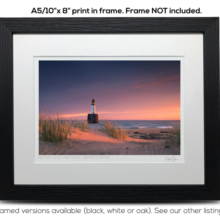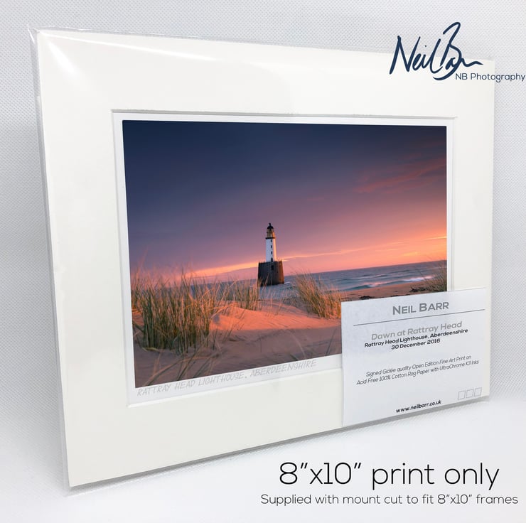 Supplied already mounted, wrapped & with signed labels & certificate, the image is printed on A5 size fine art paper (148x210mm). The actual image size is smaller (see listing images for sizes - image approx. 185x123mm) to allow for the signature & inscription. The 100% acid-free mount is cut to fit standard ready-made frames from high street stores. EXTERNAL mount size is 10"x8". This is the OUTSIDE size of the mount (and thus the size your frame should be).