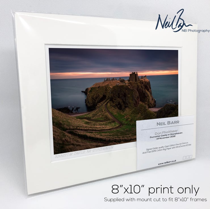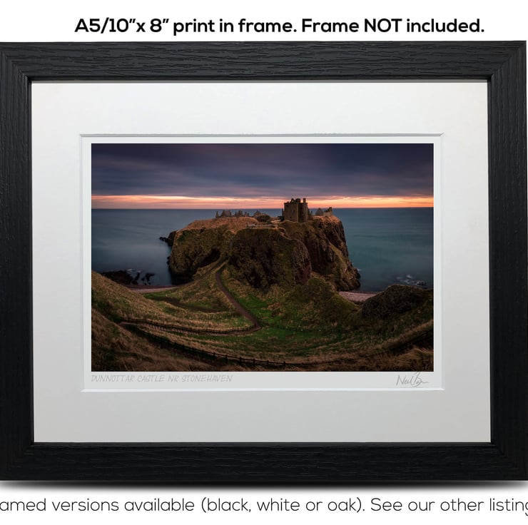 Supplied already mounted, wrapped & with signed labels & certificate, the image is printed on A5 size fine art paper (148x210mm). The actual image size is smaller (see listing images for sizes - image approx. 185x123mm) to allow for the signature & inscription. The 100% acid-free mount is cut to fit standard ready-made frames from high street stores. EXTERNAL mount size is 10"x8". This is the OUTSIDE size of the mount (and thus the size your frame should be).