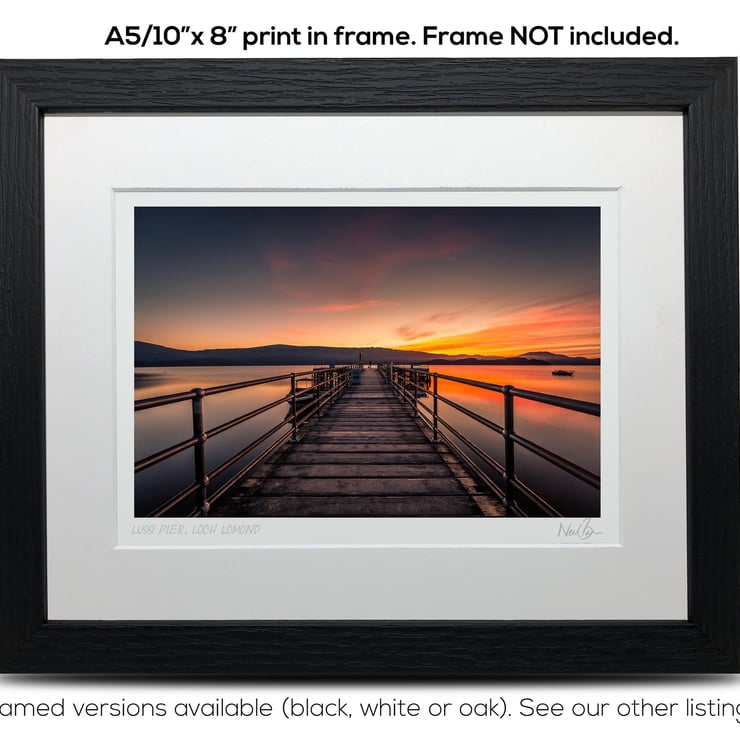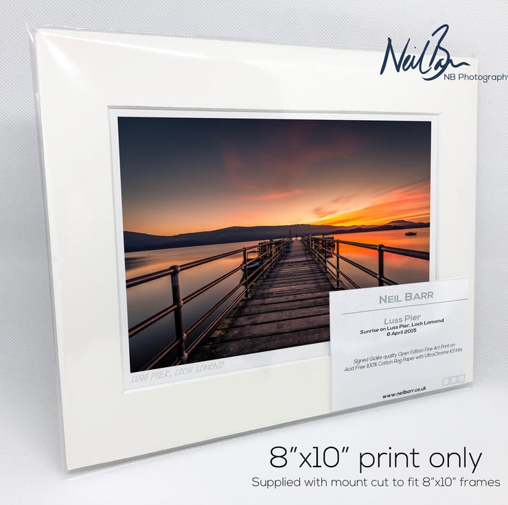 Supplied already mounted, wrapped & with signed labels & certificate, the image is printed on A5 size fine art paper (148x210mm). The actual image size is smaller (see listing images for sizes - image approx. 185x123mm) to allow for the signature & inscription. The 100% acid-free mount is cut to fit standard ready-made frames from high street stores. EXTERNAL mount size is 10"x8". This is the OUTSIDE size of the mount (and thus the size your frame should be).