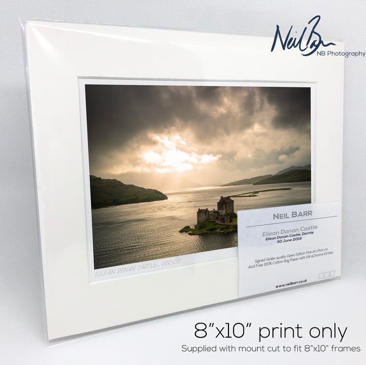 Supplied already mounted, wrapped & with signed labels & certificate, the image is printed on A5 size fine art paper (148x210mm). The actual image size is smaller (see listing images for sizes - image approx. 185x123mm) to allow for the signature & inscription. The 100% acid-free mount is cut to fit standard ready-made frames from high street stores. EXTERNAL mount size is 10"x8". This is the OUTSIDE size of the mount (and thus the size your frame should be).
