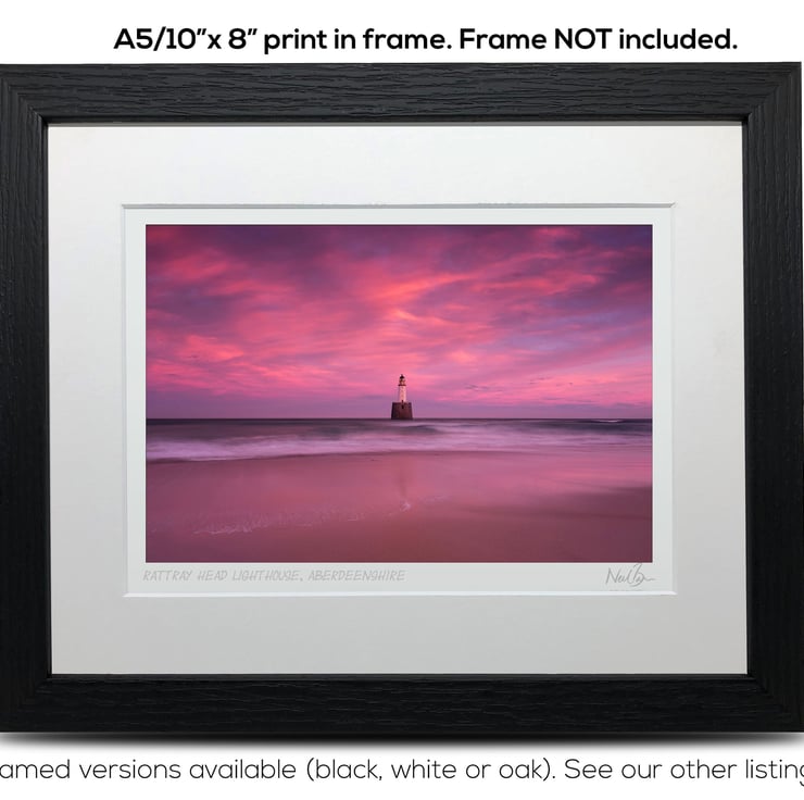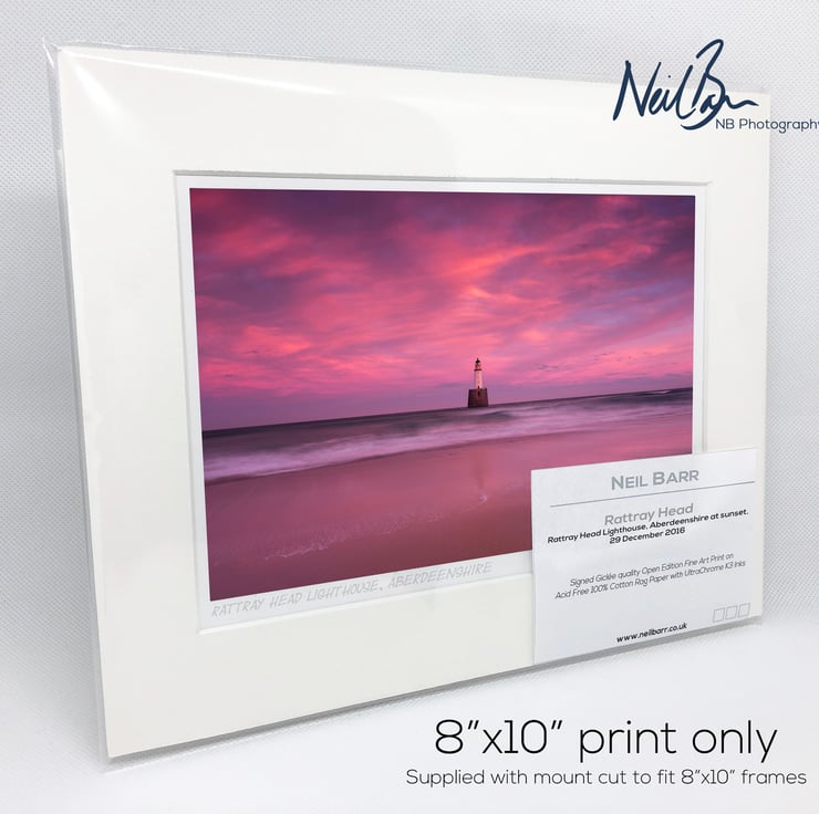 Supplied already mounted, wrapped & with signed labels & certificate, the image is printed on A5 size fine art paper (148x210mm). The actual image size is smaller (see listing images for sizes - image approx. 185x123mm) to allow for the signature & inscription. The 100% acid-free mount is cut to fit standard ready-made frames from high street stores. EXTERNAL mount size is 10"x8". This is the OUTSIDE size of the mount (and thus the size your frame should be).