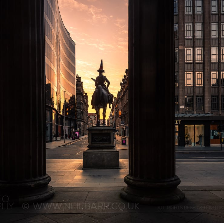 Image: "The Duke" - The Duke of Wellington statue with his famous traffic cone hat, Queen Street, Glasgow at dawn, 14 April 2018 - by Scotland photographer Neil Barr