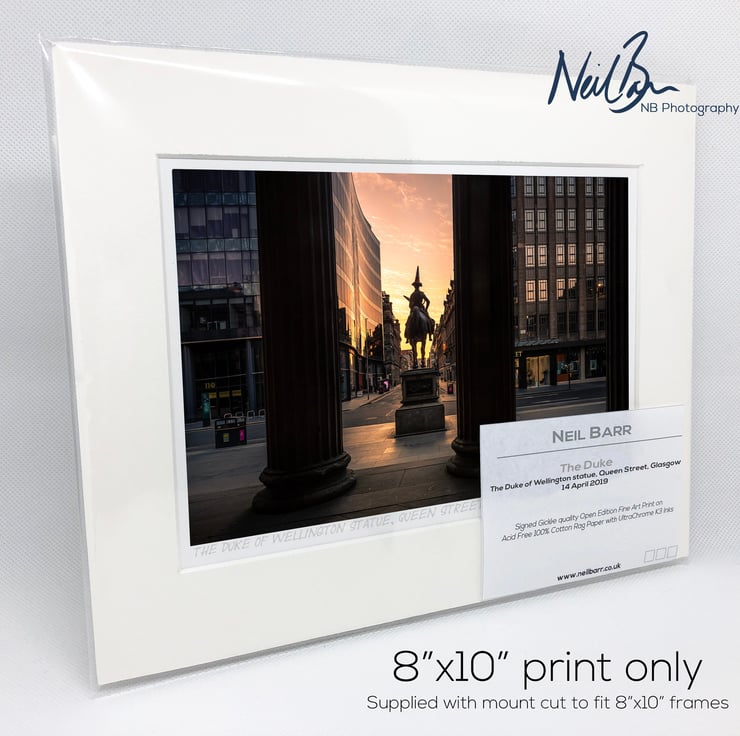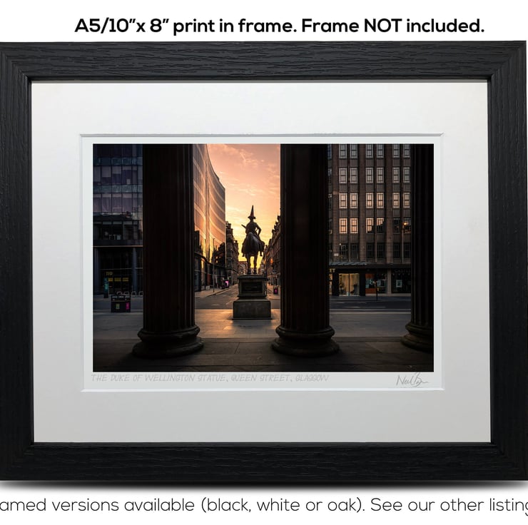 Supplied already mounted, wrapped & with signed labels & certificate, the image is printed on A5 size fine art paper (148x210mm). The actual image size is smaller (see listing images for sizes - image approx. 185x123mm) to allow for the signature & inscription. The 100% acid-free mount is cut to fit standard ready-made frames from high street stores. EXTERNAL mount size is 10"x8". This is the OUTSIDE size of the mount (and thus the size your frame should be).