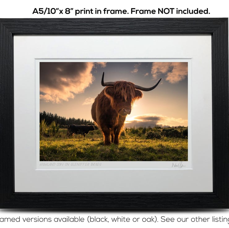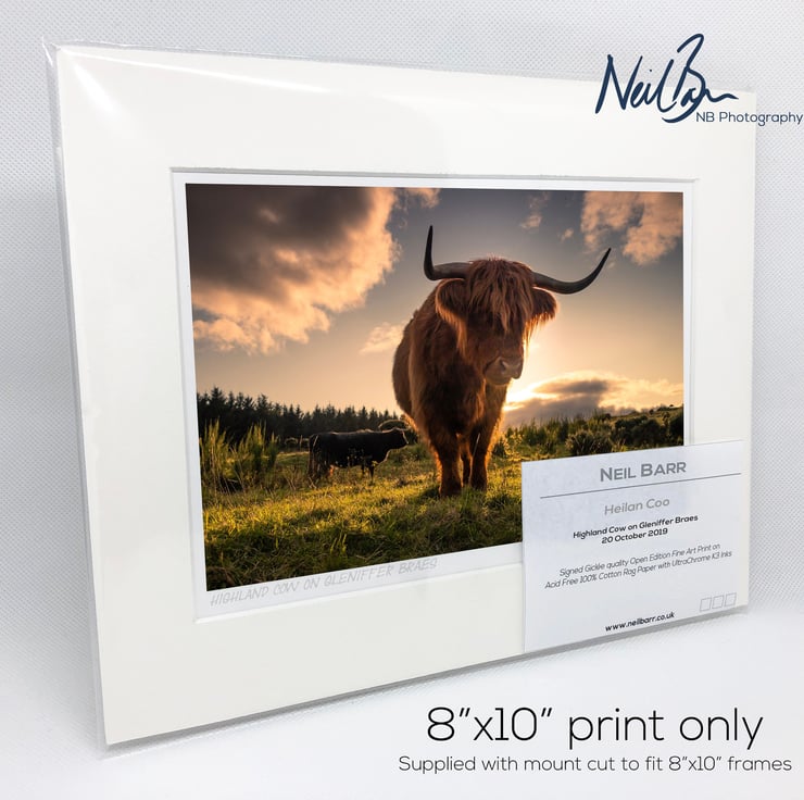 Supplied already mounted, wrapped & with signed labels & certificate, the image is printed on A5 size fine art paper (148x210mm). The actual image size is smaller (see listing images for sizes - image approx. 185x123mm) to allow for the signature & inscription. The 100% acid-free mount is cut to fit standard ready-made frames from high street stores. EXTERNAL mount size is 10"x8". This is the OUTSIDE size of the mount (and thus the size your frame should be).