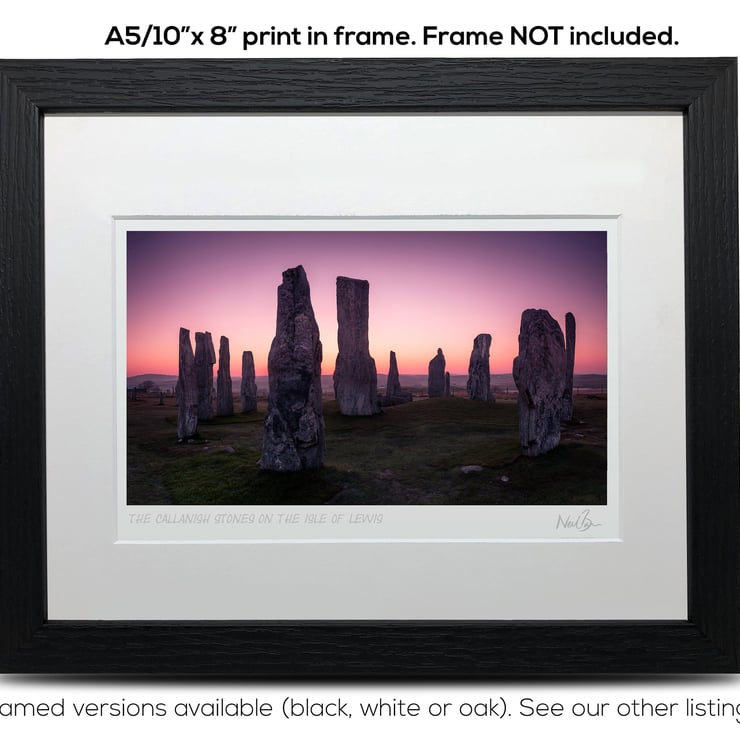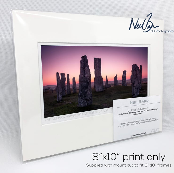 Supplied already mounted, wrapped & with signed labels & certificate, the image is printed on A5 size fine art paper (148x210mm). The actual image size is smaller (see listing images for sizes - image approx. 185x105mm) to allow for the signature & inscription. The 100% acid-free mount is cut to fit standard ready-made frames from high street stores. EXTERNAL mount size is 10"x8". This is the OUTSIDE size of the mount (and thus the size your frame should be).