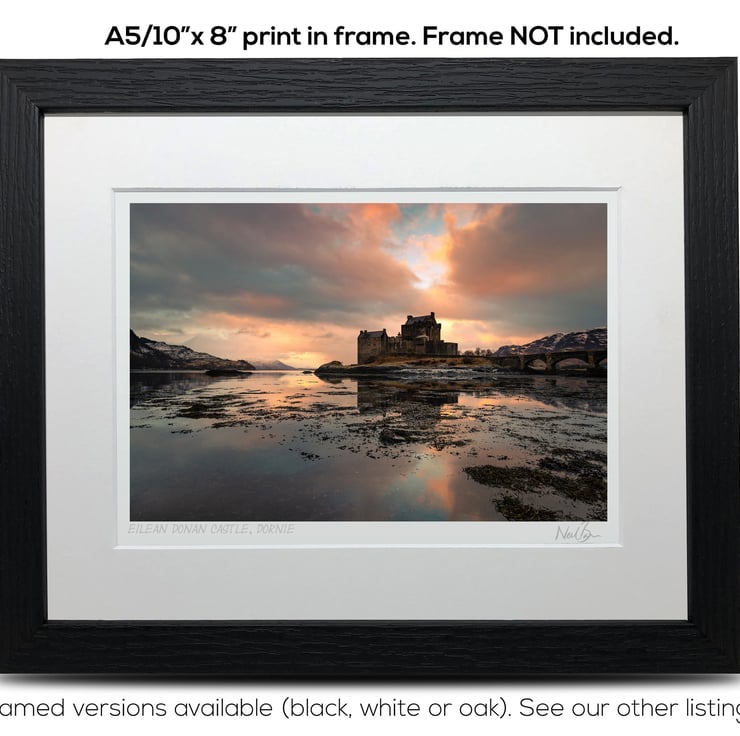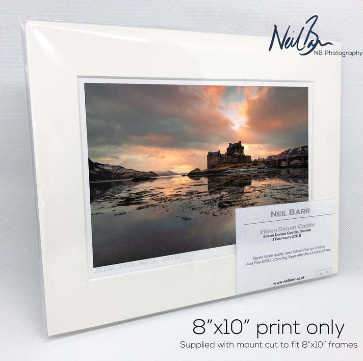 Supplied already mounted, wrapped & with signed labels & certificate, the image is printed on A5 size fine art paper (148x210mm). The actual image size is smaller (see listing images for sizes - image approx. 185x123mm) to allow for the signature & inscription. The 100% acid-free mount is cut to fit standard ready-made frames from high street stores. EXTERNAL mount size is 10"x8". This is the OUTSIDE size of the mount (and thus the size your frame should be).