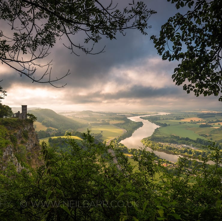 Image: "Dawn over the River Tay" - Kinnoull Tower and the River Tay at sunrise from Kinnoull Hill, 1 July 2018 - by Scotland photographer Neil Barr