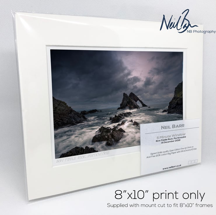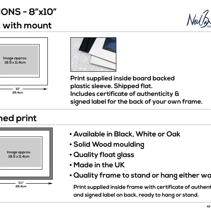 Supplied already mounted, wrapped & with signed labels & certificate, the image is printed on A5 size fine art paper (148x210mm). The actual image size is smaller (see listing images for sizes - image approx. 185x123mm) to allow for the signature & inscription. The 100% acid-free mount is cut to fit standard ready-made frames from high street stores. EXTERNAL mount size is 10"x8". This is the OUTSIDE size of the mount (and thus the size your frame should be).