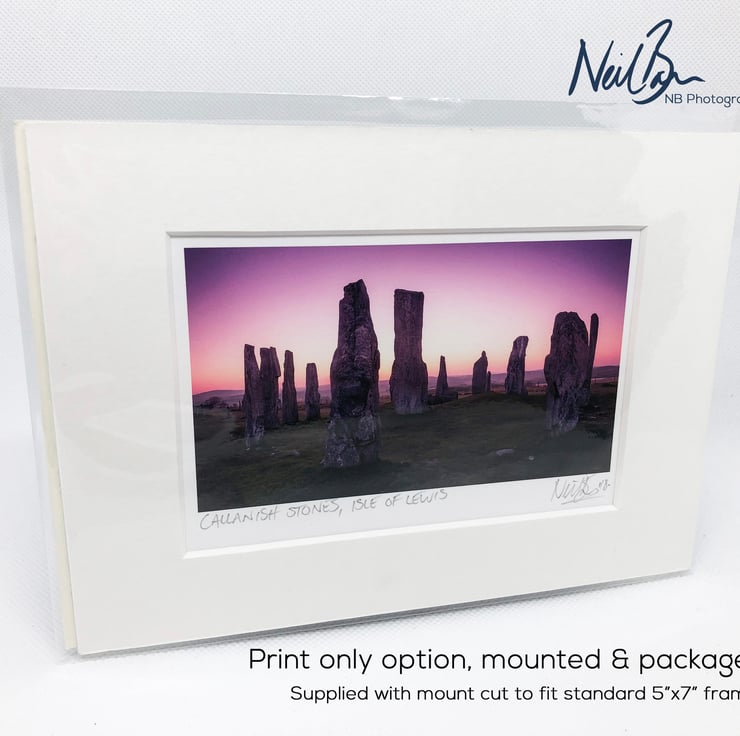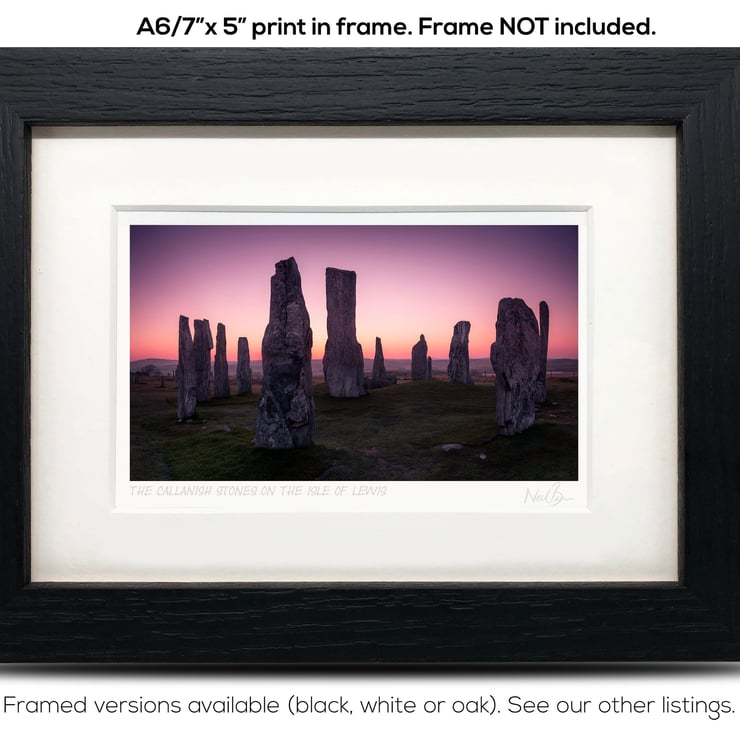 Supplied already mounted, wrapped & with signed labels & certificate, the image is printed on A6 size fine art paper (148x105mm). The actual image size is smaller (see listing images for sizes - image approx. 115x65mm) to allow for the signature & inscription. The 100% acid-free mount is cut to fit standard ready-made frames from high street stores. EXTERNAL mount size is 7"x5". This is the OUTSIDE size of the mount (and thus the size your frame should be).