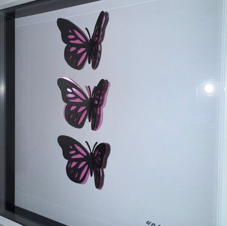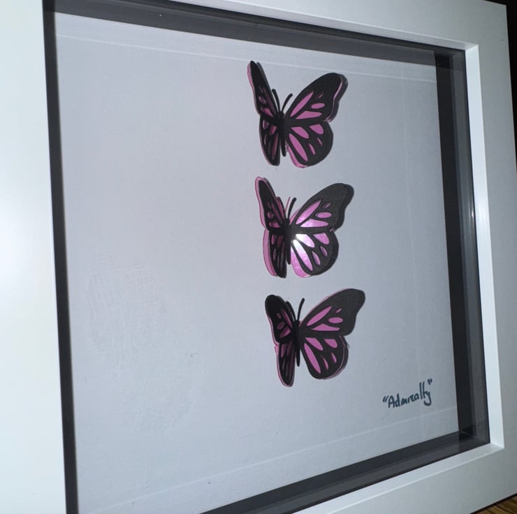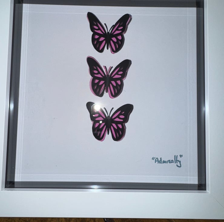 Beautiful box frame with 3 black paper butterflies backed with red acetate. I think this is incredibly pretty and as the light moves around so does the shadow. The box frame measures 17.5x17.5cm and can be hung or placed on a flat surface.