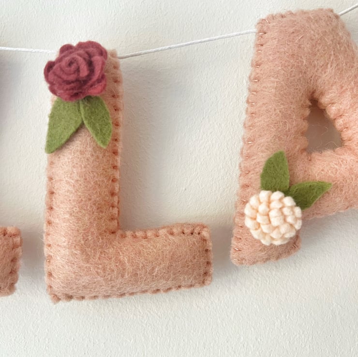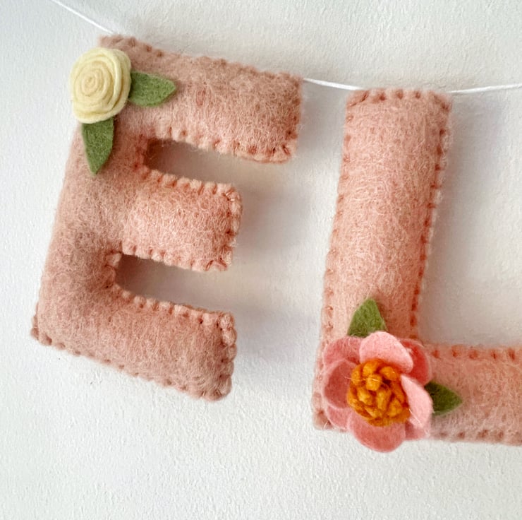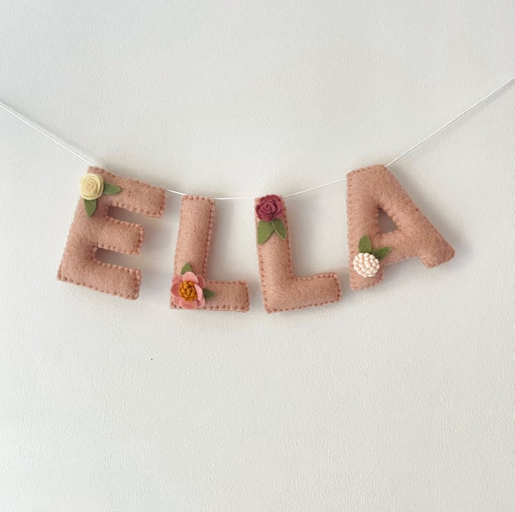 A dusky pink name garland embellished with flowers.