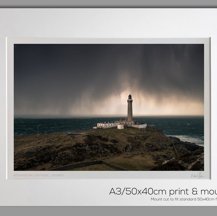Image: "Ardnamurchan Lighthouse" - Ardnamurchan Lighthouse, Ardnamurchan Point, Lochaber as a heavy hail shower approaches, 16 March 2017 - by Scotland photographer Neil Barr