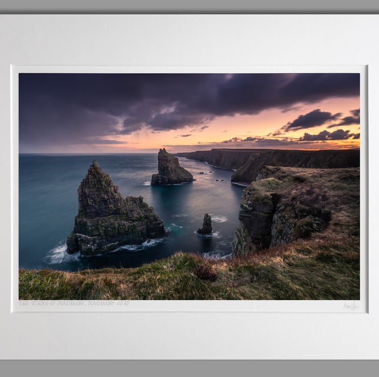 Image: "Stacks of Duncansby" - The Stacks of Duncansby, Duncansby Head at sunset, 1 February 2020 - by Scotland photographer Neil Barr