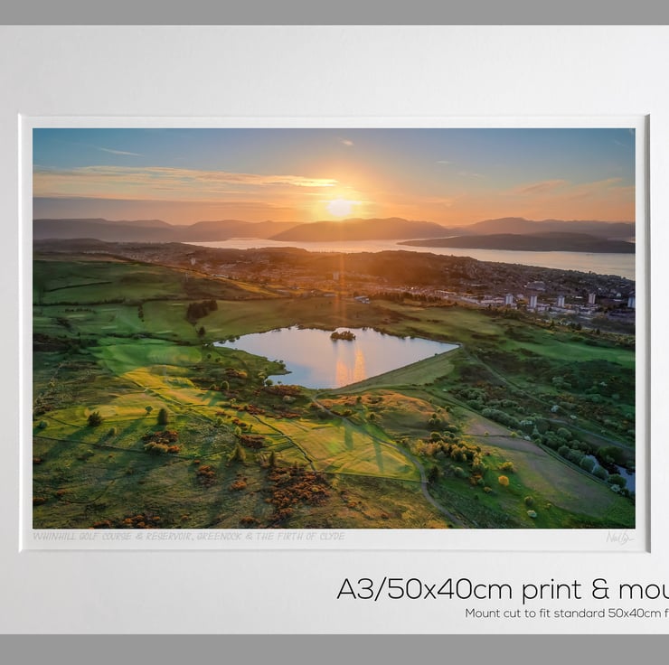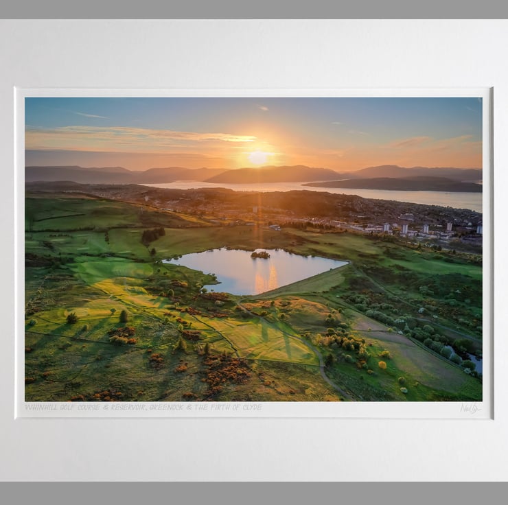 Image: "Whinhill" - Whinhill Golf Course and Whinhill Reservoir above Greenock and the Firth of Clyde across to Argyll at sunset, 6 June 2021 - by Scotland photographer Neil Barr