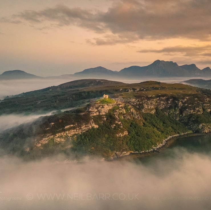 Image: "Castle Varrich" - Castle Varrich and Ben Loyal from the Kyle of Tongue at sunset, 19 September 2020 - by Scotland photographer Neil Barr