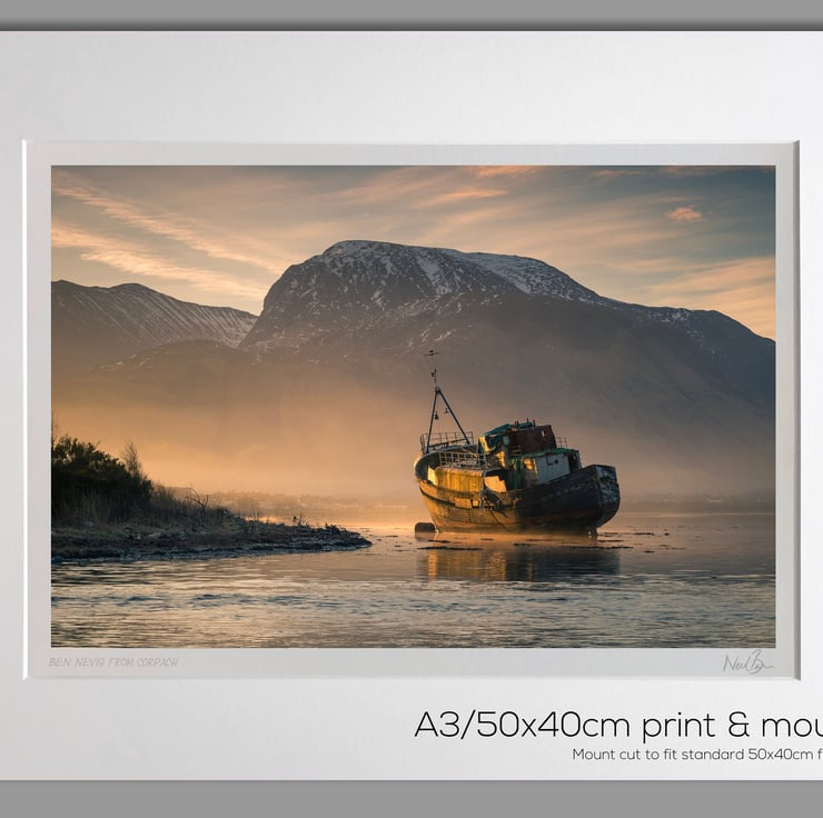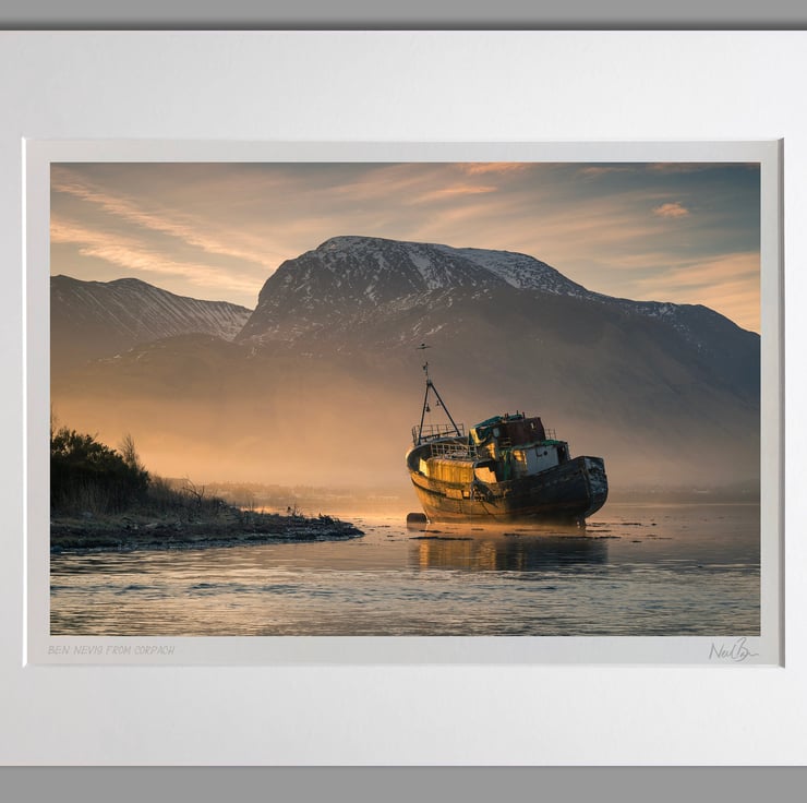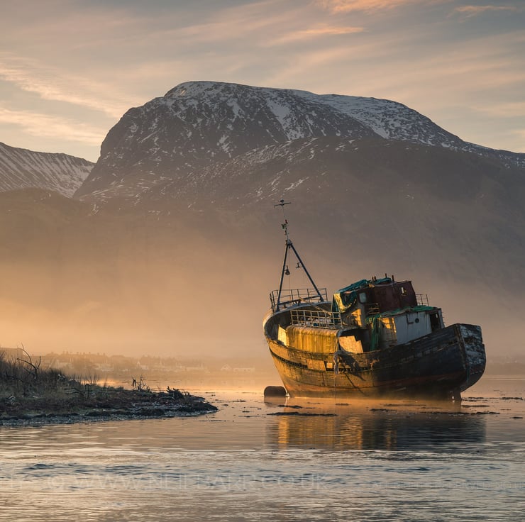 Image: "Dayspring" - The dawn sun rising, illuminating the boat wreck at Corpach with Ben Nevis & Fort William behind, 28 March 2017 - by Scotland photographer Neil Barr