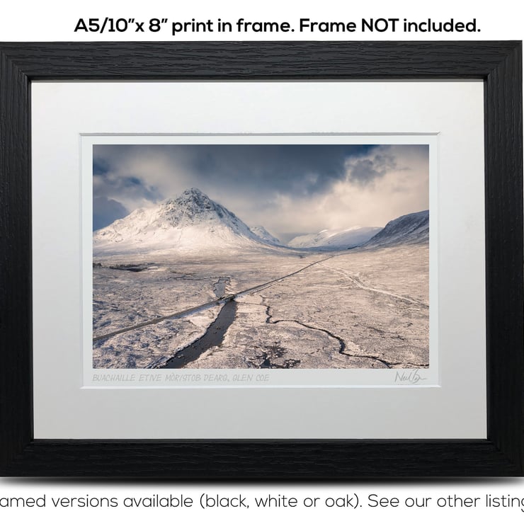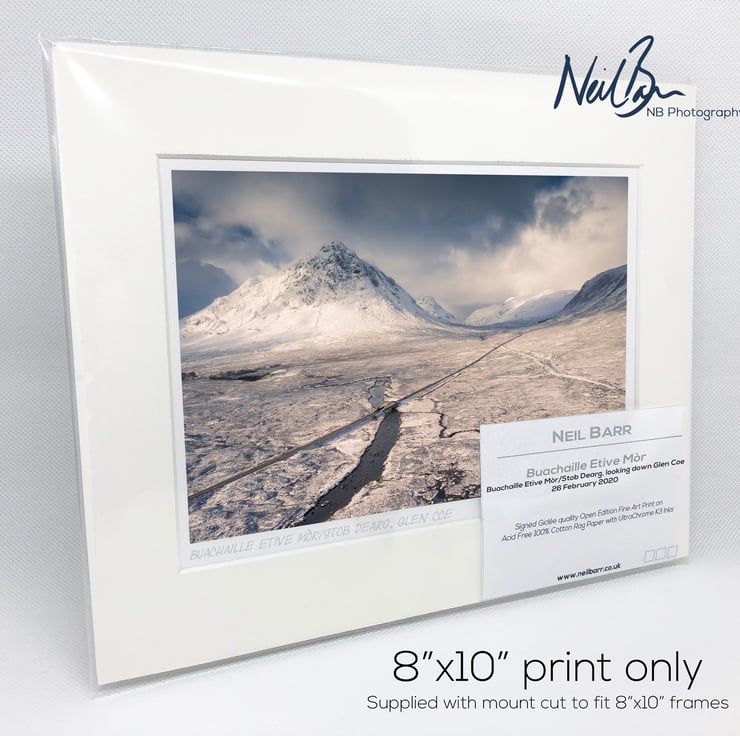 Supplied already mounted, wrapped & with signed labels & certificate, the image is printed on A5 size fine art paper (148x210mm). The actual image size is smaller (see listing images for sizes - image approx. 185x123mm) to allow for the signature & inscription. The 100% acid-free mount is cut to fit standard ready-made frames from high street stores. EXTERNAL mount size is 10"x8". This is the OUTSIDE size of the mount (and thus the size your frame should be).