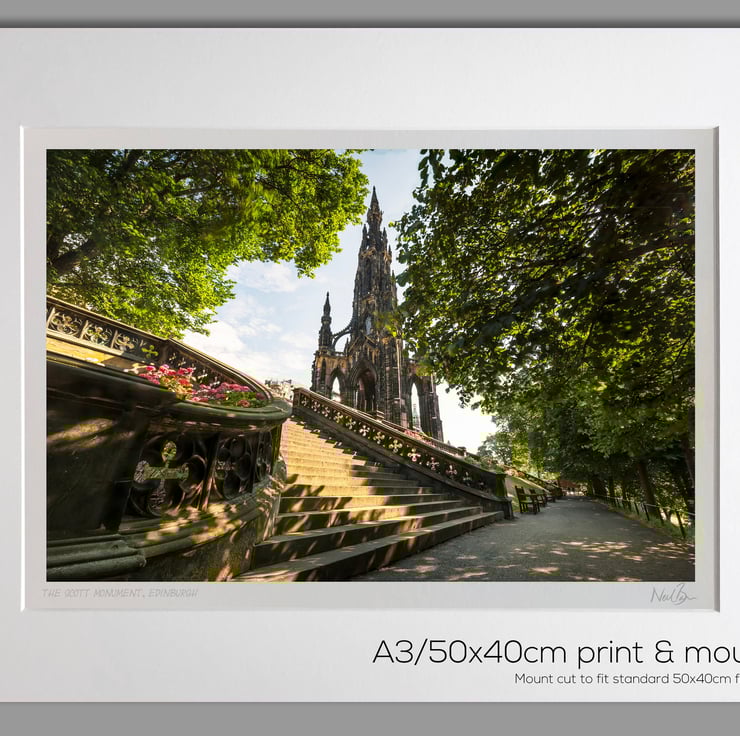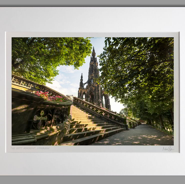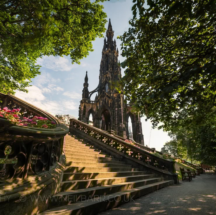 Image: "The Scott Monument" - The Scott Monument from Princes Street Gardens East, Edinburgh on a sunny morning, 19 July 2018 - by Scotland photographer Neil Barr