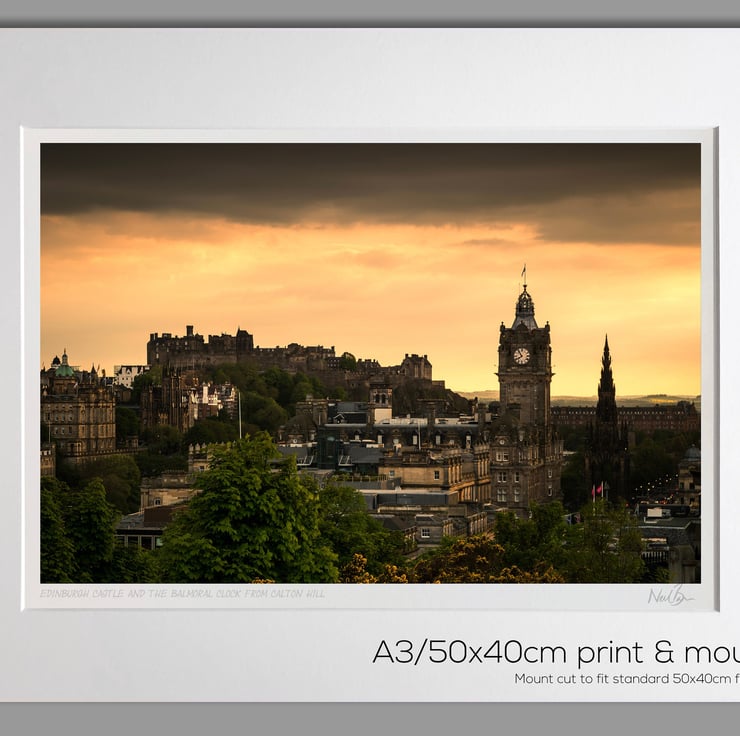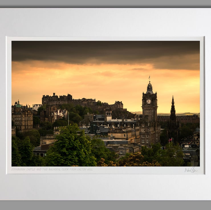 Image: "Edinburgh Castle" - Edinburgh Castle and The Balmoral Clock from Calton Hill at sunset, 18 May 2018 - by Scotland photographer Neil Barr