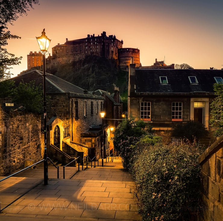 Image: "The Vennel" - Edinburgh Castle and The Vennel, Edinburgh at dusk, 13 May 2018 - by Scotland photographer Neil Barr