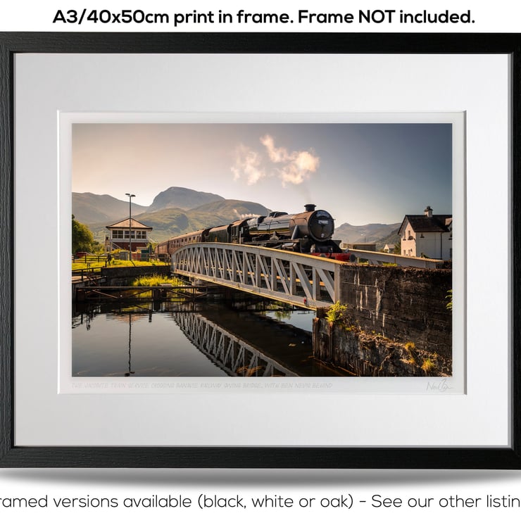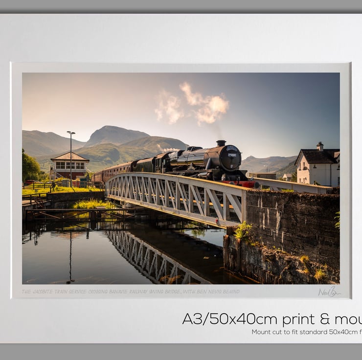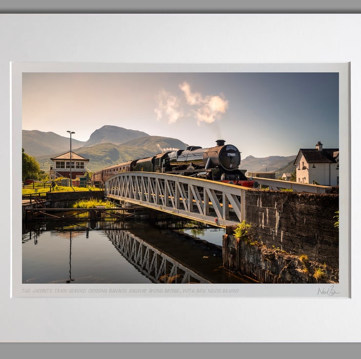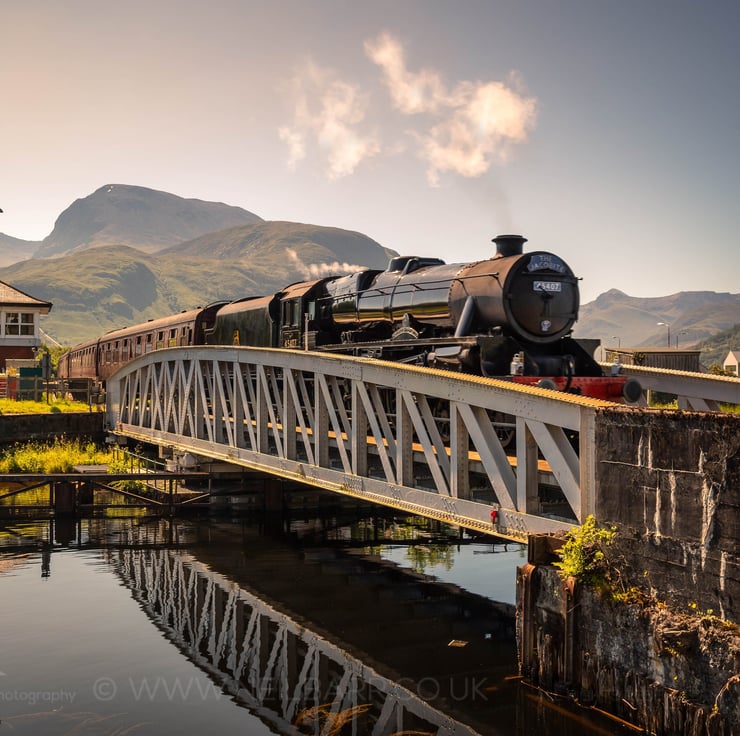 Image: "The Jacobite" - The Jacobite train service crossing Banavie Railway Swing Bridge over the Caledonian Canal, with Ben Nevis behind, 27 June 2019 - by Scotland photographer Neil Barr