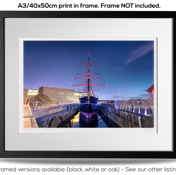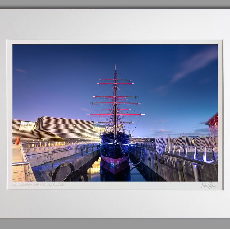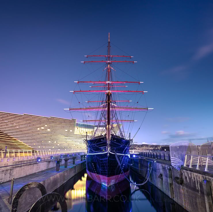 Image: "RRS Discovery" - RRS Discovery and the V&A Dundee at dusk, 28 October 2019 - by Scotland photographer Neil Barr