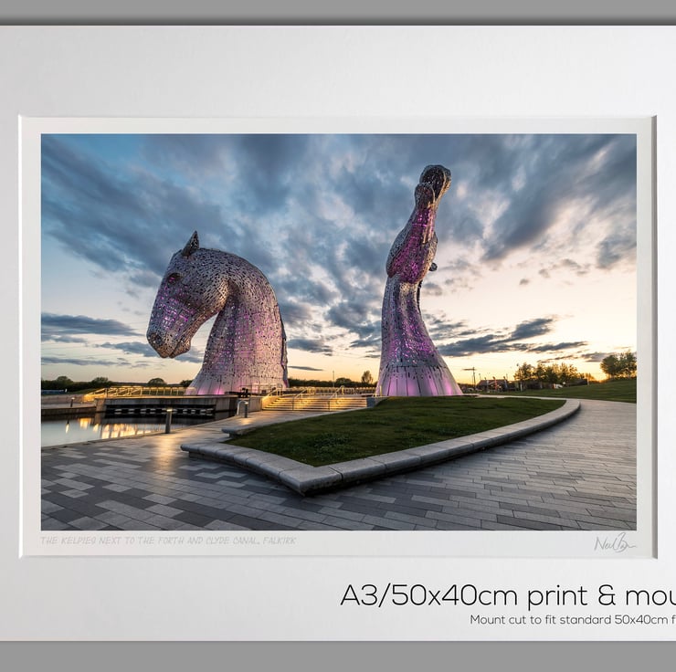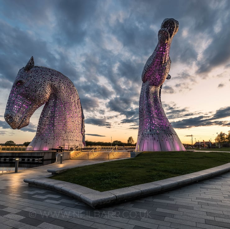 Image: "The Kelpies" - The Kelpies at dusk in The Helix parkland, next to the Forth and Clyde Canal, Falkirk, 11 May 2019 - by Scotland photographer Neil Barr