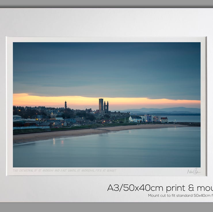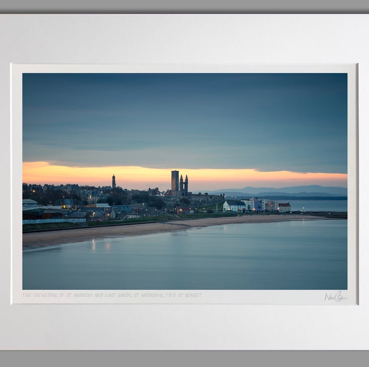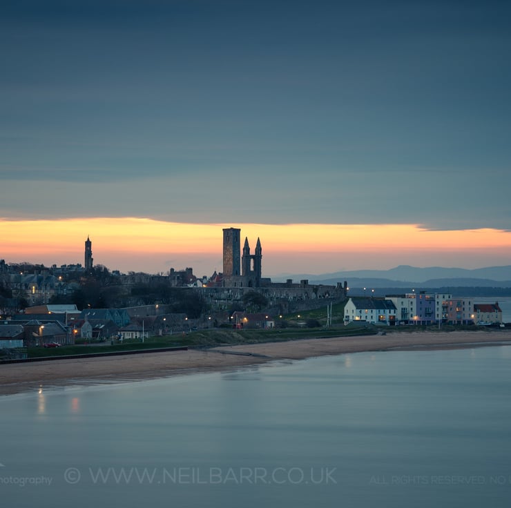 Image: "Cathedral of St Andrew" - The Cathedral of St Andrew and East Sands, St Andrews, Fife at sunset, 28 March 2019 - by Scotland photographer Neil Barr