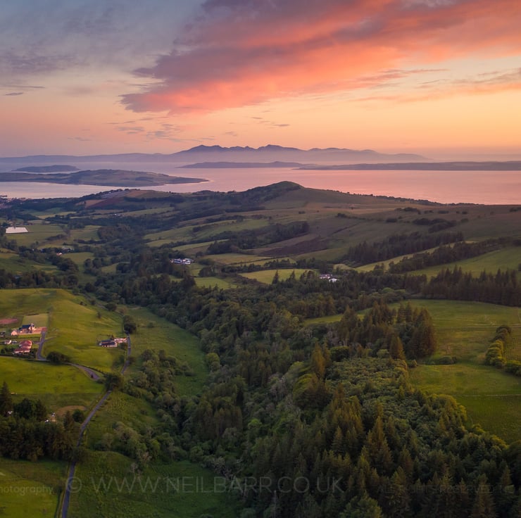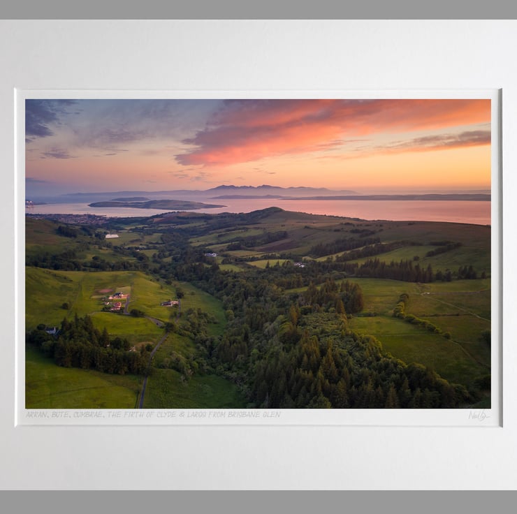Image: "Arran from Brisbane Glen" - Arran, Argyll, Bute, Little & Great Cumbrae, the Firth of Clyde and Largs from Brisbane Glen at sunset, 28 June 2021 - by Scotland photographer Neil Barr