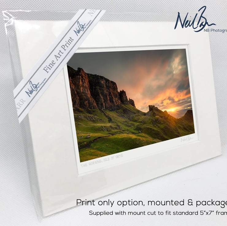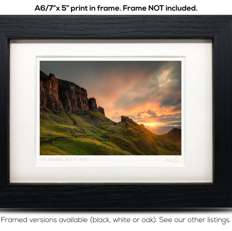 Supplied already mounted, wrapped & with signed labels & certificate, the image is printed on A6 size fine art paper (148x105mm). The actual image size is smaller (see listing images for sizes - image approx. 115x77mm) to allow for the signature & inscription. The 100% acid-free mount is cut to fit standard ready-made frames from high street stores. EXTERNAL mount size is 7"x5". This is the OUTSIDE size of the mount (and thus the size your frame should be).