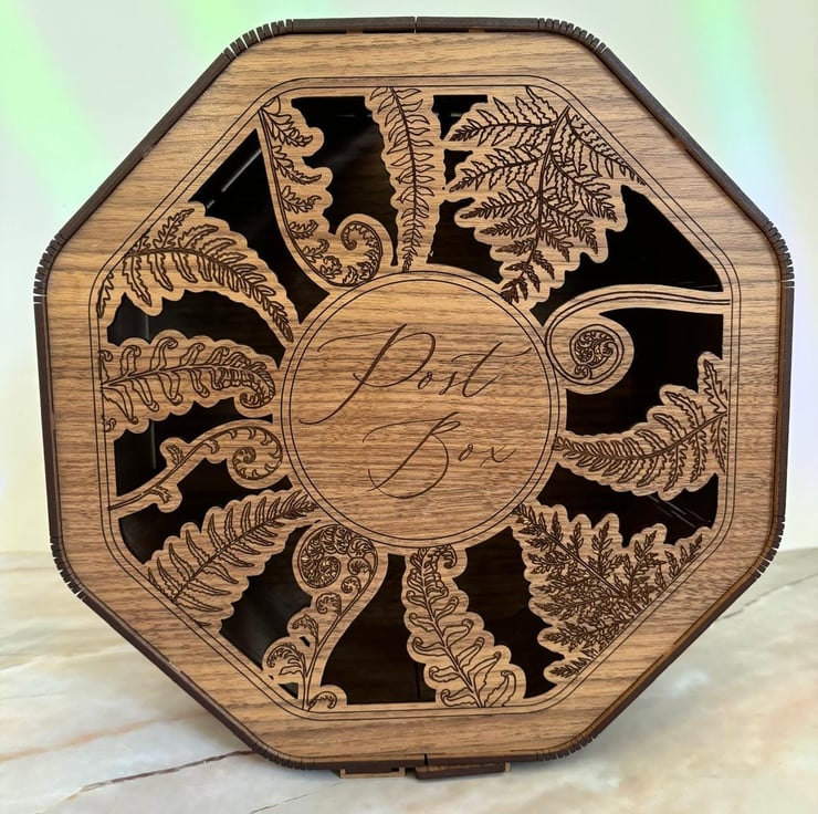 Large Personalised Engraved Hexagon Wooden Wedding Post Box with Ferns for Wedding Cards, Walnut Wedding Post Box, Wedding Card Box